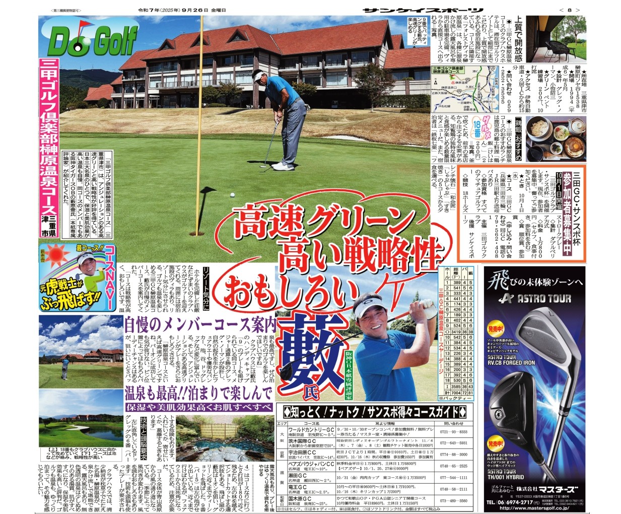 9月26日(金)のスポーツ新聞サンケイスポーツにて、当コースメンバーであり、元阪神タイガースの藪恵壹様に榊原温泉コースをご紹介いただきました。